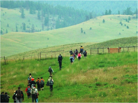 After a long walk through these grasslands we finally emerged at the trees which Mike affectionately called “marker” trees. The kids were eating their lunch under the trees away from the sun which was starting to come through now. On top of the hill beside the marker trees you could see for miles and clearly mark the different ecological zones. The lower, middle and upper grasslands, the transition zone into the Douglas Fir forest and the big snag on top of the hill across the valley. This was where we would pass through the ranch lands on top of the ridge by McQueen Lake.